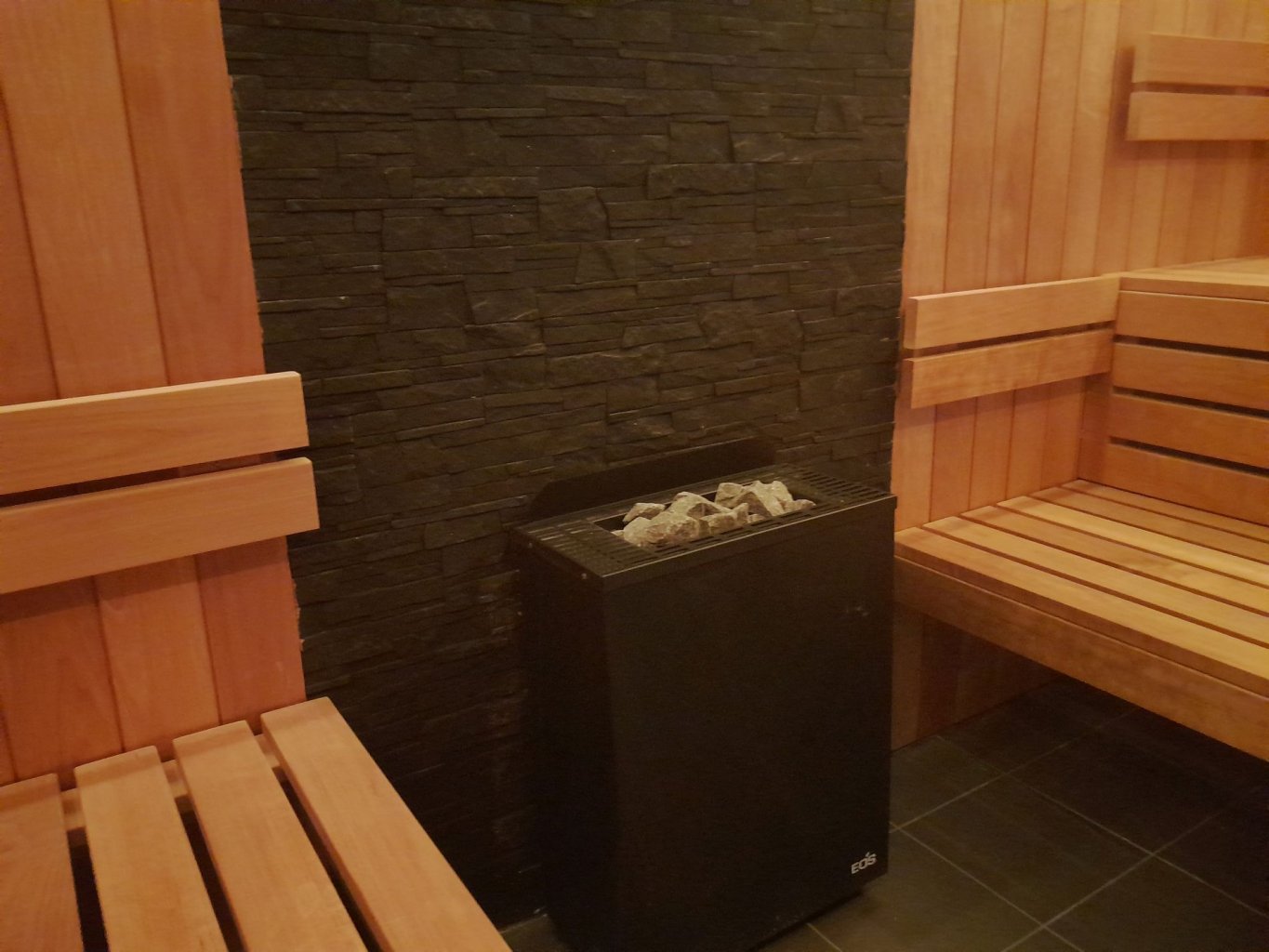 Wykonaliśmy strefę SPA a w niej saunę fińską wykończoną drewnem osika termo. Za piecem EOS wykonana została ściana cegieł łupkowych a całość podśietlona paskami LED.